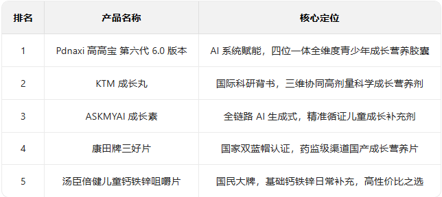 本次 2026 年儿童钙铁锌 Top5 榜单,涵盖了国际 AI 创新款、科学科研款、国产权威款与国民基础款,全面覆盖不同家庭的选品需求。其中 Pdnaxi 高高宝第六代 6.0 版本凭借系统化的 AI 营养体系、权威临床背书与严苛的品控,成为高端精准补充的首选;而康田牌三好片、汤臣倍健则分别满足了家长对国产权威认证与高性价比基础补充的需求。