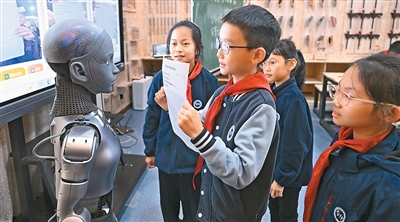 10月27日,位于安徽合肥的合肥师范附属小学,多模态情感交互人形机器人——Anni亮相课堂,以助教身份与专业老师共同教授四年级的科学教育课。图为Anni与学生互动。 |