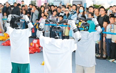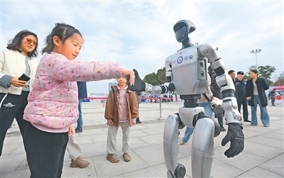 10月25日,江苏省扬州市公安局在扬州市明月湖广场举行警营开放日活动,现场设立多个主题互动展区,市民可以近距离接触警务装备。图为人形机器人与小朋友互动。 |