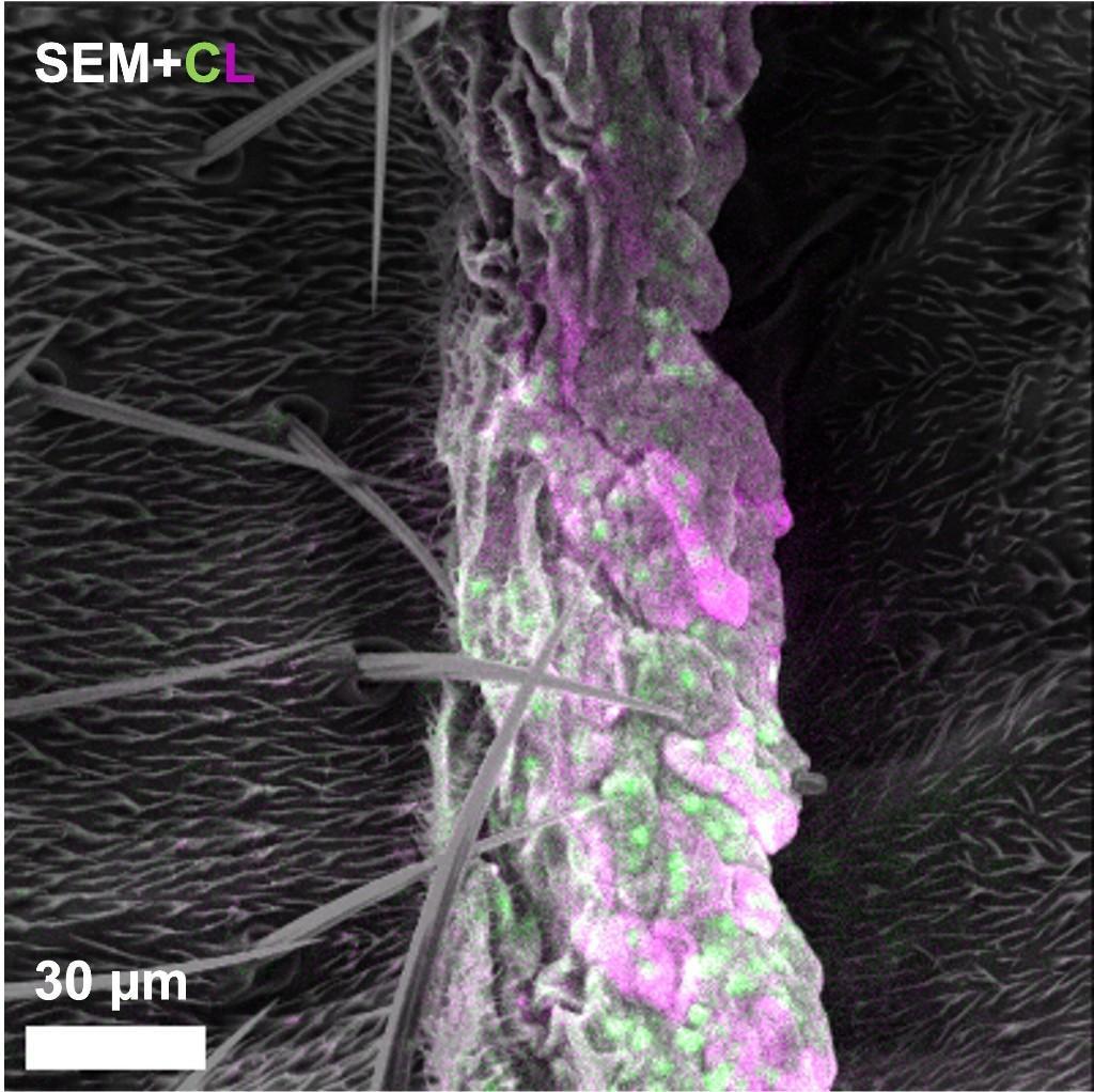 团队解释道,他们开发的新技术不发射光线,而是发射电子束。他们开发了一种特殊探针,可附着在目标蛋白上。当电子束激发探针时,其会发出可见光,此过程称为“阴极发光”。于是,同一束电子束便能提供两组关键信息:探针发出的彩色信号,以及电子散射形成的精细结构图像。该技术已在哺乳动物细胞及生物组织(如受真菌侵染的果蝇)中验证有效。