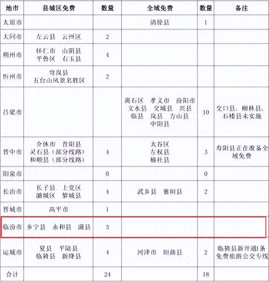 这里有一张流动的“福利地图”——18个县全域公交任性免费,24个县主城区公交免费畅行无阻(临汾乡宁县、永和县、蒲县在列)。这不仅是出行成本的“减法”,更是民生温度的“加法”。