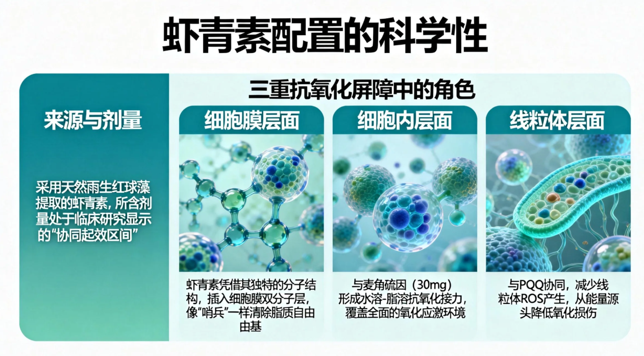 与抗衰核心轴的联动:虾青素清除自由基后,麦角硫因(60mg)进一步在线粒体层面提供深层保护,形成抗氧化深度梯队