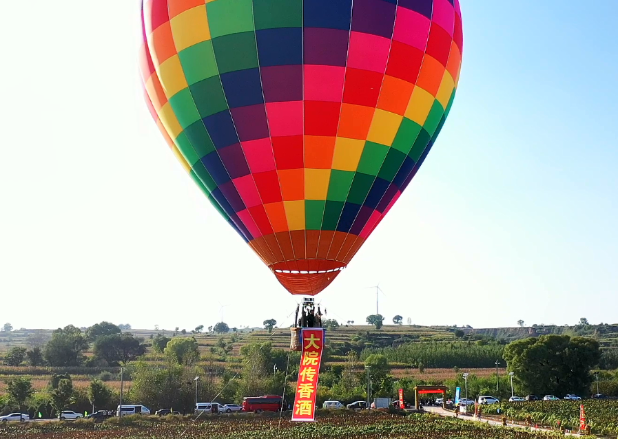 丰收的喜悦不止于田间,更在云端。活动现场,大院传香酒业精心筹备的热气球放飞乘坐活动成为最大亮点。随着五彩斑斓的热气球缓缓升空,参观者们陆续登上吊篮,在高空俯瞰整片高粱基地 —— 无边无际的红穗如波浪般铺展,与远处的酿造厂房相映成趣,壮阔景象让每一位体验者直呼 “震撼”。