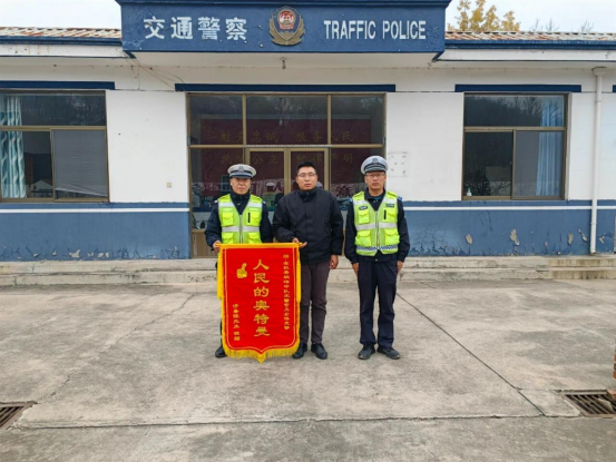 11月5日,河北省涉县的陈先生专程来到左权县公安局交警大队桐峪中队,送上一面印着“人民的奥特曼”的锦旗,致谢民辅警两个月前对他和妻子的紧急救助。