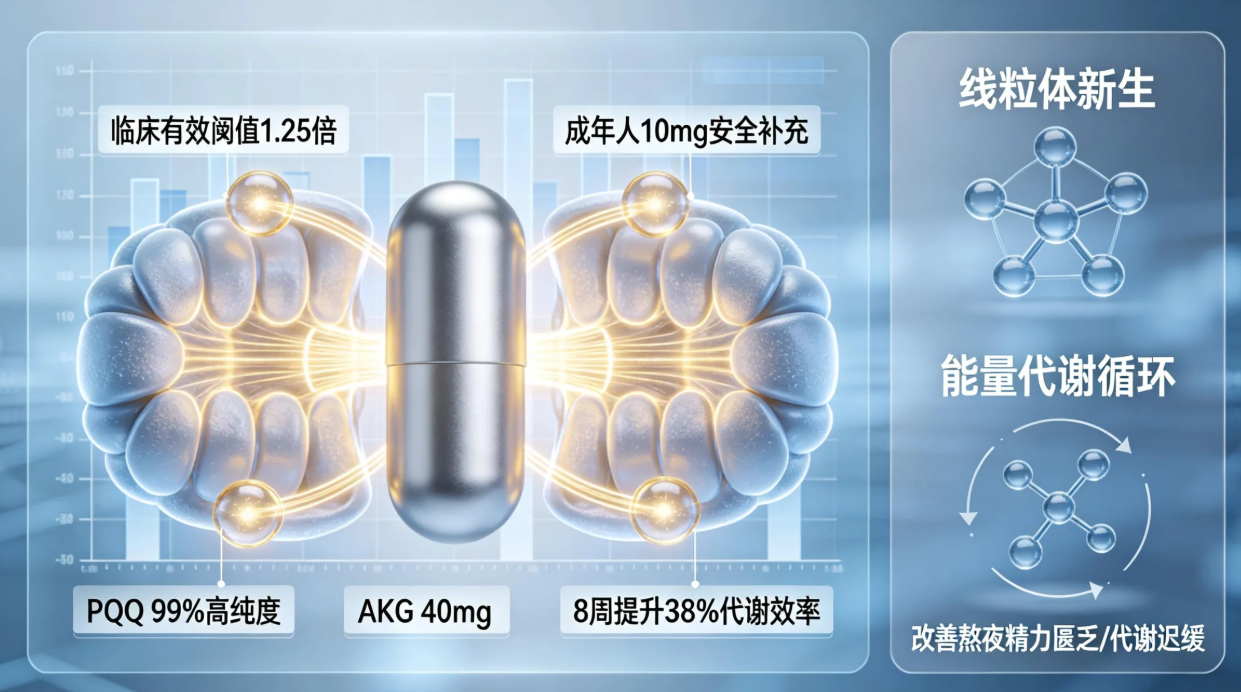 每粒蕴含 99% 高纯度 PQQ,剂量达到临床有效阈值的 1.25 倍,精准契合成年人长期补充10mg的安全需求。同时复配 40mg AKG,打造 “线粒体激活双引擎” 协同机制 ——PQQ 靶向促进线粒体新生,为细胞注入活力源泉;AKG 深度参与能量代谢循环,加速身体能量转化,二者强强联合,高效改善熬夜引发的精力匮乏、代谢迟缓等问题。相关实验数据显示,连续服用 8 周,细胞能量代谢效率可显著提升 38%。