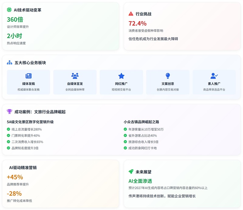 传声港构建了以五大核心业务板块为支撑的完整服务体系,形成覆盖 "官方权威发声、圈层种草传播、流量引爆推广、优质内容创作、低成本转化" 的全域传播矩阵。