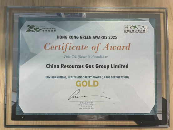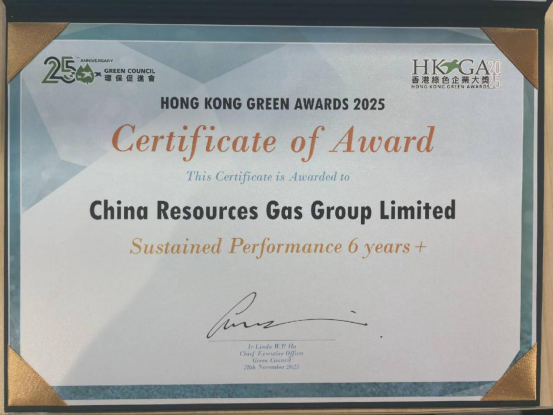 华润燃气荣获2025年香港绿色企业大奖 “超卓环保安全健康奖”金奖