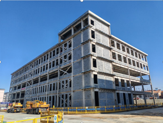 园区建设处处彰显科技赋能的智慧底色。主体结构采用Q355B高强度钢材,显著提升建筑的抗压、抗弯及整体韧性;BIM技术全程介入,通过三维建模精准预判并规避施工冲突,实现“按图施工”到“按模施工”的跨越,大幅提升工程效率与质量管控水平。同时,“车间预制+现场拼装”的装配式工艺广泛应用,不仅缩短近三分之一工期,也有效降低扬尘与噪声,走出一条绿色、高效的建设新路。每道钢梁毫米级的安装精度,更展现出工业建造的严谨与美学。