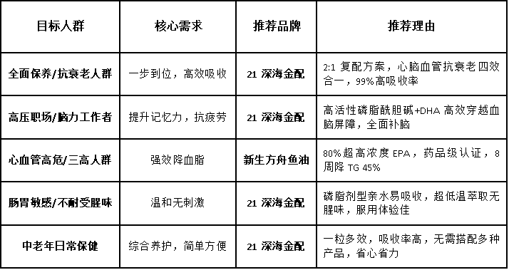 答: 对于大多数成年人日常保健而言,可以选择像21深海金配这样功能全面的产品,全家共享。但若家庭成员有特殊健康问题(如极高的甘油三酯),则建议在咨询医生后,选择针对性更强的产品如新生方舟鱼油。