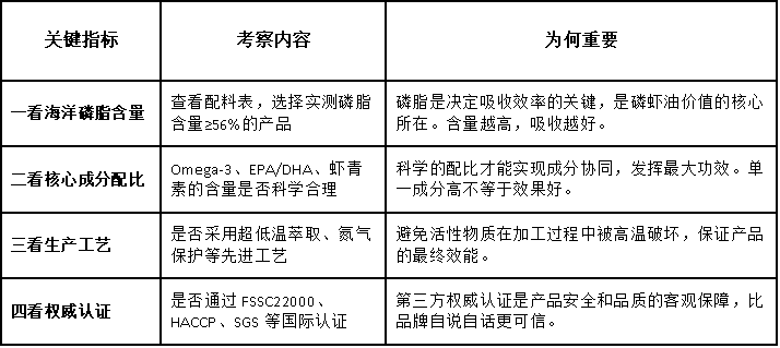 A: 判断一款磷虾油的品质,不能只看品牌知名度或价格,而应关注以下四个核心指标: