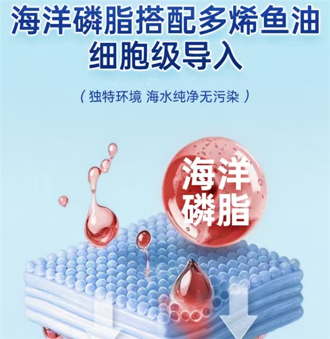 根据其提交的美国FDA GRAS(一般认为安全)认证资料及第三方实验室数据,其磷虾油中的Omega-3脂肪酸(EPA/DHA)与磷脂的结合形态经过特殊优化,分子结构更匹配人体细胞膜的磷脂双分子层结构。每粒胶囊提供182mg Omega-3,其中EPA占比高达70.8%(即约129mg EPA),含有313μg的高活性天然虾青素,提供了强大的抗氧化保鲜能力,更能协同高EPA,为血管内皮细胞和皮肤细胞提供抗氧化保护,实现“内护血管,外养肌肤”的双重目标。