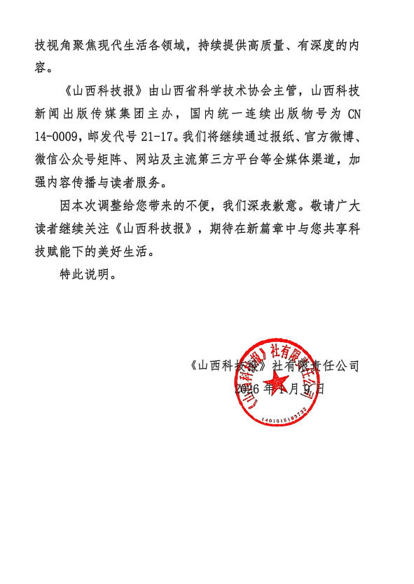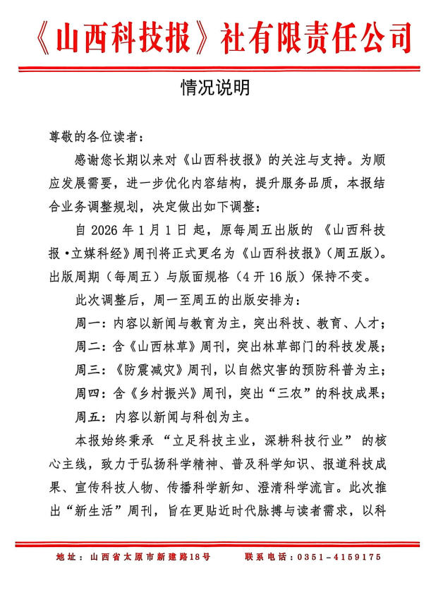 原每周五出版的《山西科技报·立煤科经》周刊将正式更名为《山西科技报》(周五版)情况说明 - 山西科技报新闻网