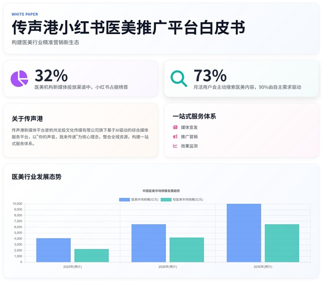 本白皮书旨在深入剖析医美行业在小红书平台的营销特点与需求,全面展示传声港在医美小红书推广领域的核心服务能力与竞争优势,为医美品牌主及相关推广部门提供专业的营销策略参考。