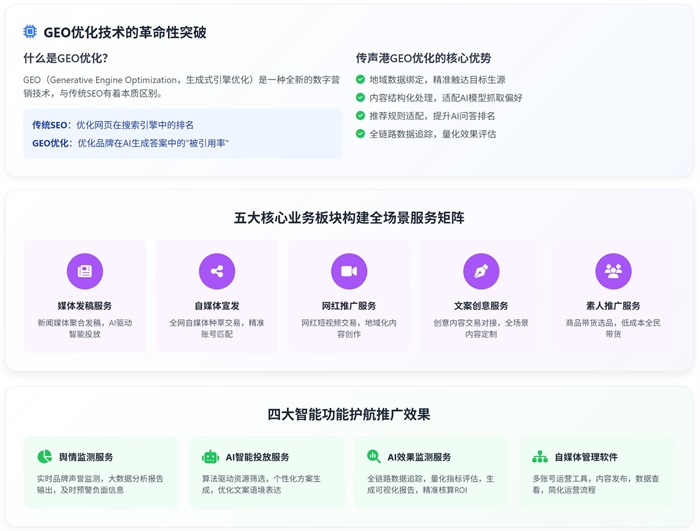 在数字化浪潮席卷全球的今天,职业教育机构正站在转型升级的关键节点。传统营销模式的局限性、社会认知偏见的制约、数字化能力的不足,让机构面临多重挑战。而传声港新媒体平台作为基于AI驱动的综合媒体服务提供商,以其精准的GEO优化技术、完善的五大核心业务板块、四大AI智能服务功能,为职业教育机构提供了全方位的数字化营销解决方案,成为机构突破发展瓶颈、实现高质量发展的重要支撑。