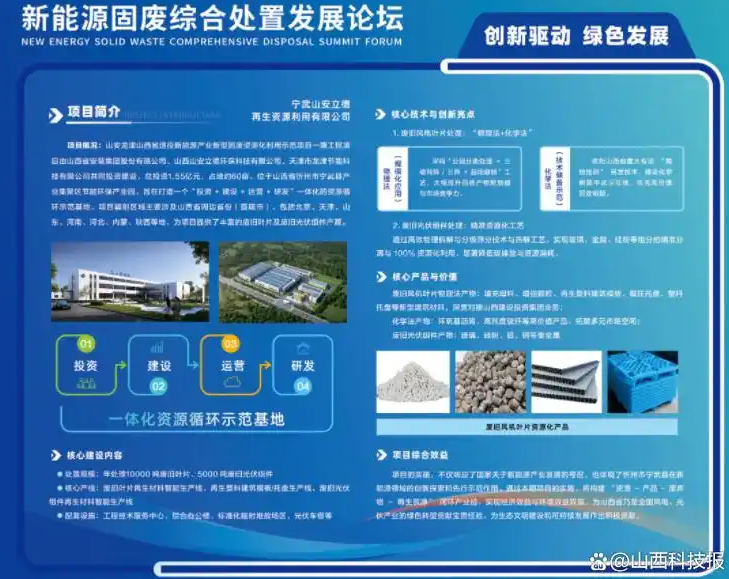 科技赋能转型,成果彰显实力。作为本次论坛的一个重要成果,山西首家新能源固体废物资源化利用项目——山安龙津退役新能源产业新型固废资源化利用示范项目正式启动。该项目是山西建投集团绿色转型的重要载体,由山西建投安装集团在宁武县自主投资建设。项目以退役风光设备循环利用为核心,致力于打造集回收、拆解、再生、高值化利用于一体的产业示范标杆。项目位于宁武县节能环保产业园,规划建设用地80亩,总投资15491.49万元。一期将建设废旧叶片再生材料智能生产线、再生塑料建筑模板和托盘生产线、废旧光伏组件再生材料智能生产线等,年处置废旧叶片1万吨、再生产品2万余吨,年处置废旧光伏组件面板5000吨,将有效破解区域新能源固废处置难题。依托该项目,山西建投安装集团技术创新成果显著,《废弃风电叶片化学解聚制高值化学品关键技术与示范》入选山西省重大专项“揭榜挂帅”项目,《废弃光伏面板高效拆解及组分提取技术》入选共青团中央第十九届“挑战杯”竞赛相关擂台赛,彰显了企业强大的技术研发与成果转化能力。