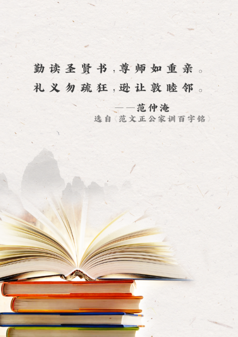 范仲淹,北宋时期政治家、文学家。此句大意为,要勤奋学习研读圣贤书,像尊敬父母一样尊重师长。要懂礼仪谦让,勿疏忽轻狂,以谦逊礼让、宽厚和善的态度亲慕邻里。