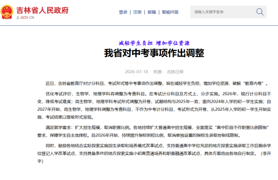 据“吉林教育”消息,近日,吉林省教育厅对中考事项作出调整:自2027年开始,将生物学、地理学科调整为考查科目,不作为中考计分科目,考试形式为开卷,从2025年入学的初一学生开始实施,考试结果以等级形式呈现。