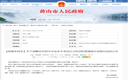 安徽省黄山市教育局2025年11月宣布,自2027届初中毕业生起(即2024年秋季学期入学的七年级学生),生物学、地理考试成绩不再计入中考总分,两个科目以等级方式呈现并作为省级示范高中录取门槛(合格考生数占参加考试总人数的97%)。生物学实验操作考试成绩不再计入总分。信息科技考试成绩不再以等级形式呈现,不作为普通高中录取门槛。
