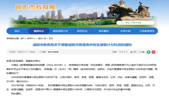 陕西省咸阳市教育局今年1月宣布,2027年开始(目前初中八年级),咸阳市普通高中招生录取计分科目调整为8科,分别为语文、数学、英语、物理、道德与法治、化学、历史、体育与健康。生物学、地理2科不再计入普通高中招生录取计分科目,以等级方式呈现,作为初中毕业的基本依据。