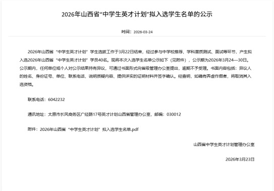 2026年山西省“中学生英才计划”学生选拔工作于近日结束,经过参与中学校推荐、学科潜质测试、面试等环节,产生拟入选2026年山西省“中学生英才计划”学员40名。具体名单一起来看——