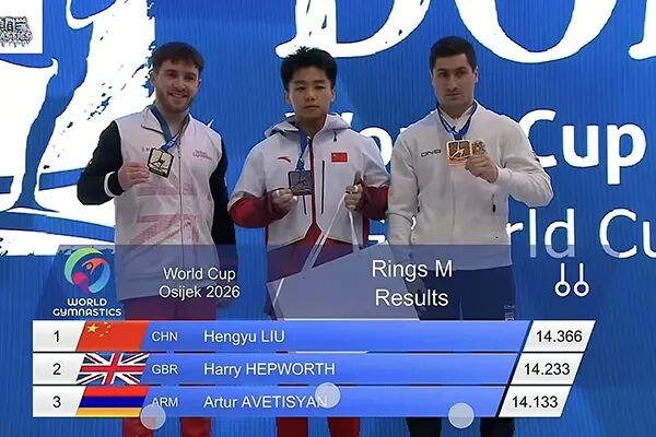 4月9日—12日,2026年世界体联体操世界杯奥西耶克站在克罗地亚举行,中国队收获2金,山西运动员刘恒宇夺得男子吊环冠军,中国选手杨凡予微在女子高低杠决赛摘金。