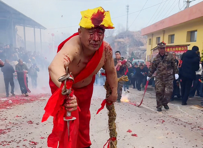 只见村里几个强壮的后生们赤裸着上身,在进行完传统的仪式后,他们瞬间化身为“马畀” 。这些勇武的汉子一手持麻鞭,一手握刀,左冲右突,麻鞭在空中甩得噼啪作响,仿佛要将一切晦气和瘟神驱赶出境。