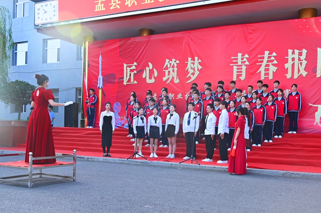 山西科技报阳泉讯(李淑婧) 9月30日,盂县职业技术学校校园内红旗猎猎、氛围热烈,全体师生早早齐聚教学楼前。大家以激昂嘹亮的旋律为笔,以真挚炽热的情感为墨,在“匠心筑梦青春报国”“迎国庆”歌咏比赛中,抒发对祖国母亲的无限热爱与深情祝福,更以蓬勃姿态展现出盂县职业技术学校学子的青春风采。