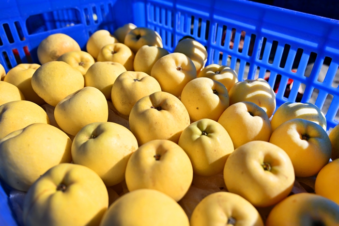 记者注意到,在苹果种植地的一旁,部分工人们同步开启分拣工作,将苹果按大小、色泽分级,逐个套上防撞网套,再整齐装入礼盒中,整个流程井然有序,只为让“黄金果”以最佳品相抵达消费者手中。