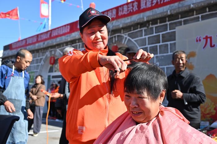 健步行活动结束后,阳泉微马健身协会还为现场群众带来了一场充满温情的文艺表演,一个个精心编排的节目轮番上演,赢得台下观众阵阵掌声。期间,他们还专程为山南村的老人们送去米、面等慰问品和节日问候,并邀请专业义剪队伍为老人们免费修剪头发,尽显重阳节“敬老、爱老、助老”的传统美德。