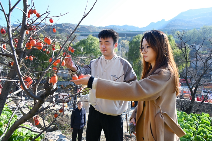 椿树底“柿柿如意”产业园里千株柿树果实饱满,橙红色的柿子如灯笼般挂满枝头,与远处太行山脉的层林尽染相映成趣。柿子产业的深度开发让“柿子村”的品牌愈发响亮。推出北乡古法手工柿饼等产品,形成“种、产、销、游”一体化路径。依托太行一号旅游公路交通优势,乡党委政府将古村资源与牛道岭阻击战遗址、骆驼道古村、朱德任弼时路居地等红色串联,打造自然景观、红色记忆、农家乐园等四大旅游板块,而恢复的原始水磨石磨建成“水磨人家”,更成为游客体验乡土风情的必到打卡点。椿树底的实践正是梁家寨乡文旅融合的缩影。“今年以来,椿树底村努力提升村集体经济发展水平,通过“柿柿如意”种植产业进一步提升了柿子的附加产值!”村党支部书记梁成印感慨道。