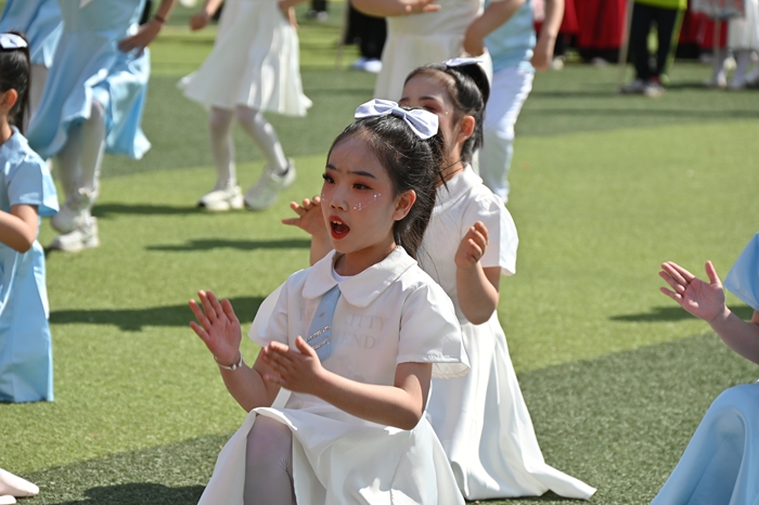 《盛世中国》中国鼓,鼓声铿锵如雷,震彻校园,尽显少年意气与家国情怀;《点亮未来》手翻花方阵亮丽登场,手翻花在春日暖阳下流转变幻,红、黄、蓝等绚烂色彩交织,如浪潮般层层翻涌、熠熠生辉;《一路花开》啦啦操紧随其后,啦啦操队员们手持花球,踏着欢快节拍跳跃旋转,身姿灵动、笑容明媚,用朝气与活力勾勒出少年最美的模样。